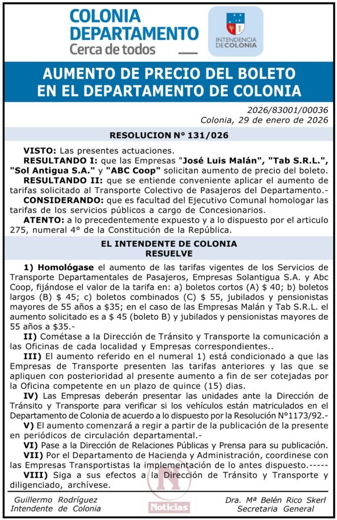 IV) Las Empresas deberán presentar las unidades ante la Dirección de Tránsito y Transporte para verificar si los vehículos están matriculados en el Departamento de Colonia de acuerdo a lo dispuesto por la Resolución N°1173/92.- V) El aumento comenzará a regir a partir de la publicación de la presente en periódicos de circulación departamental.-