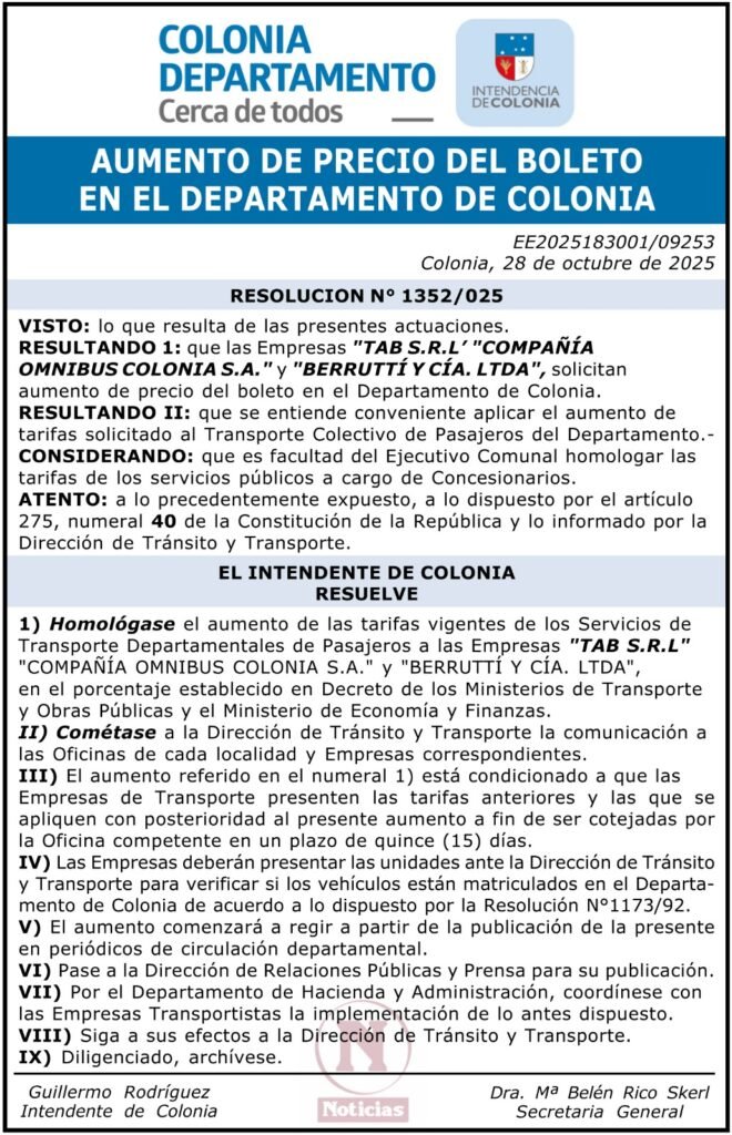 RESULTANDO I: que las Empresas «TAB S.R.L’ «COMPAÑÍA OMNIBUS COLONIA S.A.» y «BERRUTTÍ Y CÍA. LTDA», solicitan aumento de precio del boleto en el Departamento de Colonia.
