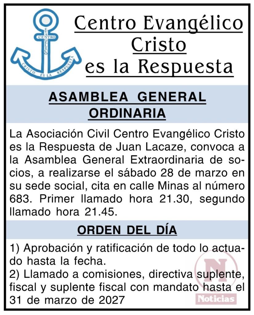Centro Evangélico Cristo es la Respuesta – Asamblea General Ordinaria