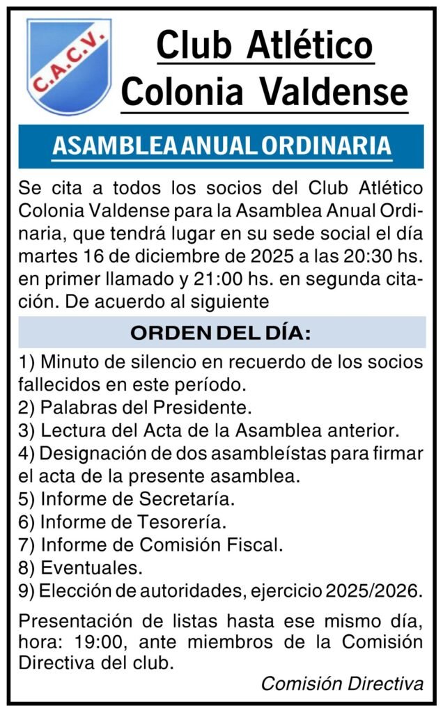 Club Atletico Colonia Valdense – Asamblea Ordinaria