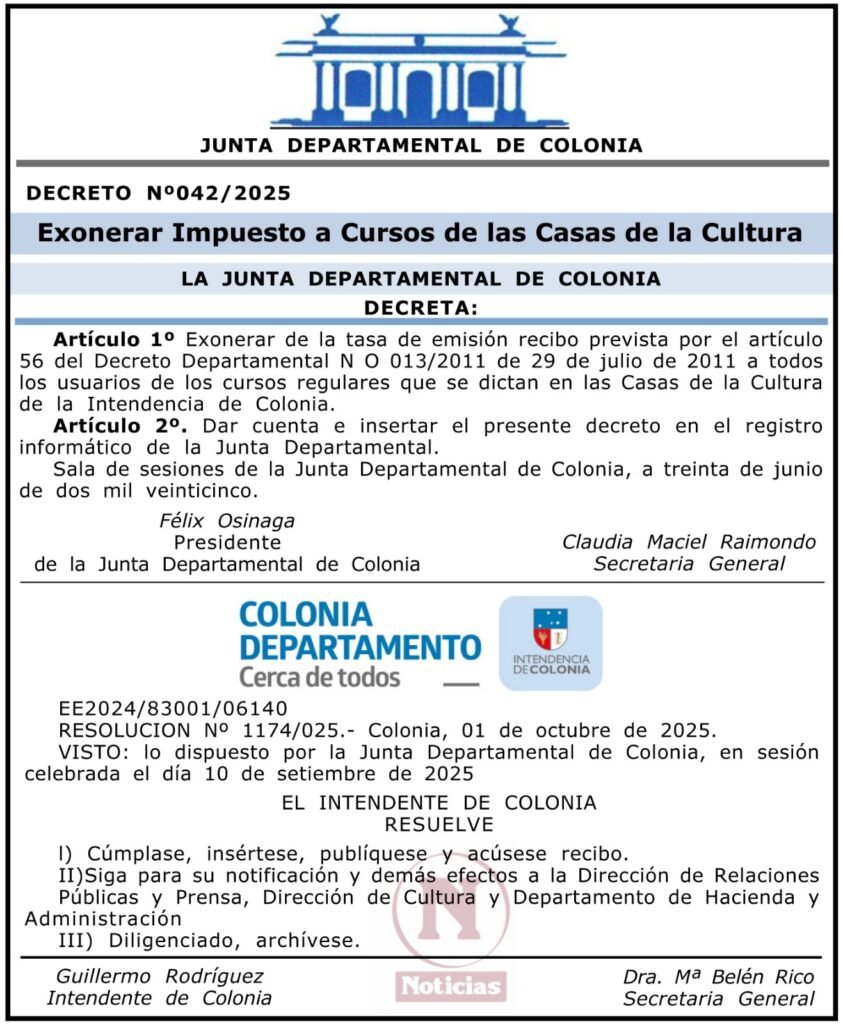 VISTO: lo dispuesto por la Junta Departamental de Colonia, en sesión celebrada el día 10 de setiembre de 2025