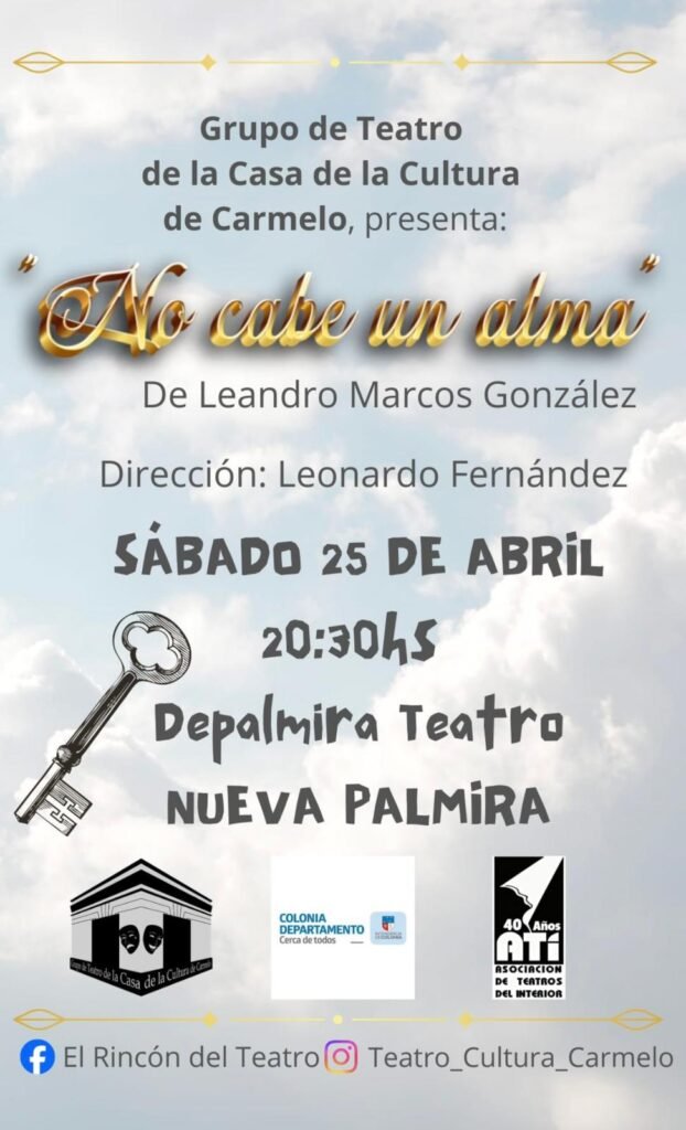 Depalmira Teatro abre la temporada 2026 con la visita del Grupo de Teatro de la Casa de la Cultura de Carmelo, con su obra “No cabe un alma” de Leandro Marcos González y la dirección del palmirense Leonardo Fernández.