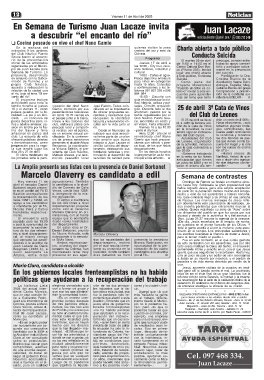 Colonia, postula a Mario de tres periodos conse- estos años de gobiernos pio no lo podemos ha- Juan Lacaze - D. Acosta 401 esq. Gardel - dom. H. 10:30