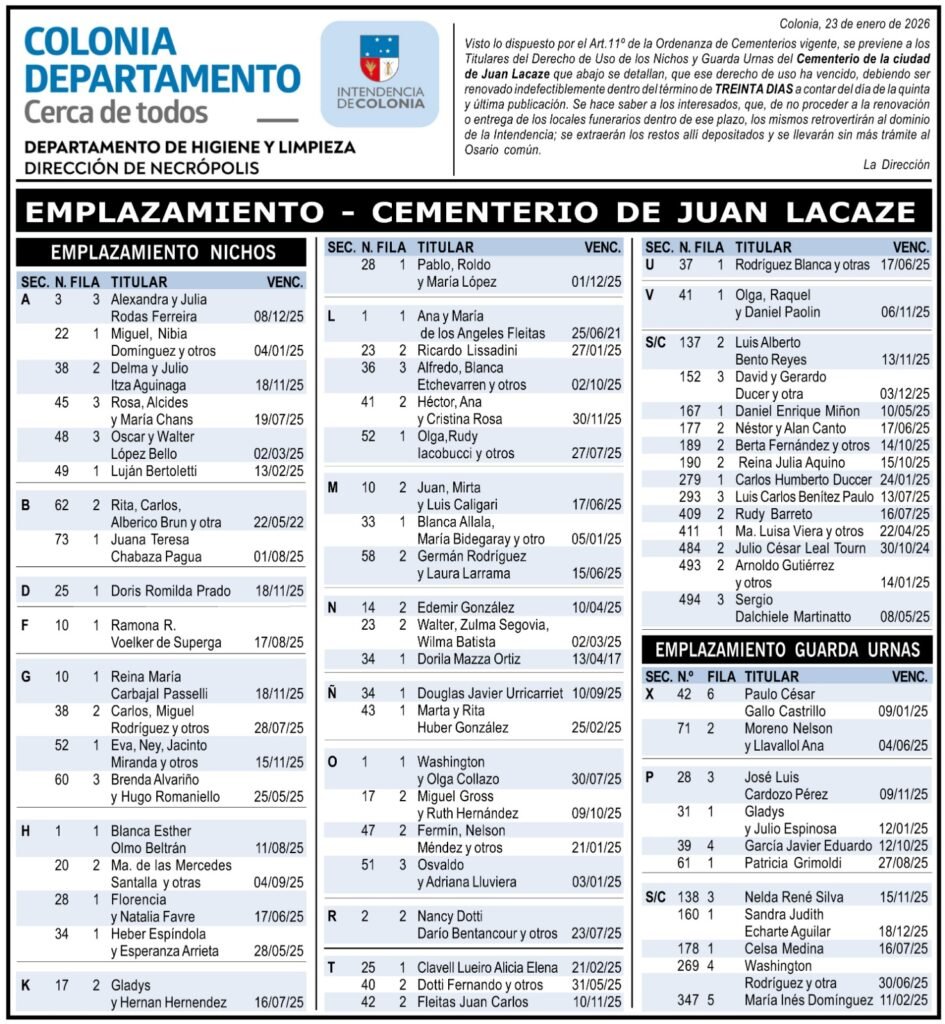 Visto lo dispuesto por el Art.11º de la Ordenanza de Cementerios vigente, se previene a los Titulares del Derecho de Uso de los Nichos y Guarda Urnas del Cementerio de la ciudad de Juan Lacaze que abajo se detallan, que ese derecho de uso ha vencido, debiendo ser renovado indefectiblemente dentro del término de TREINTA DIAS a contar del día de la quinta y última publicación.