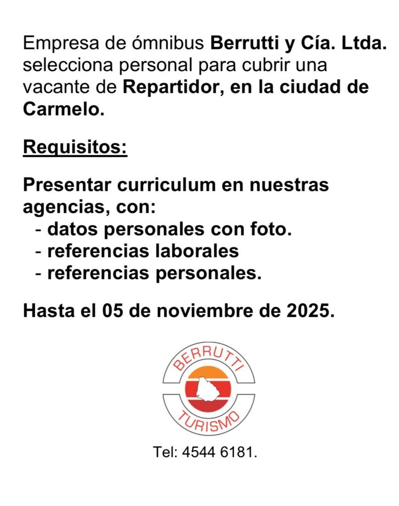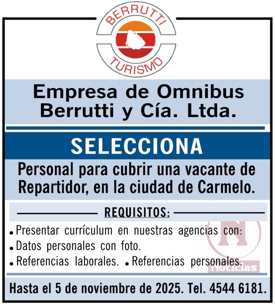 Empresa de ómnibus Berrutti y Cía. Ltda. selecciona personal para cubrir una vacante de Repartidor, en la ciudad de Carmelo.