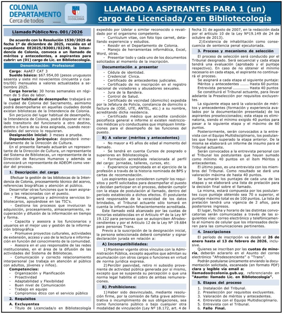 De acuerdo con la Resolución 1530/2025 de fecha 1º de diciembre de 2025, recaída en el expediente EE2025/83001/02249, la Intendencia de Colonia, convoca a un llamado de méritos y antecedentes, a aspirantes para cubrir: un (01) cargo de Lic. en Bibliotecología.