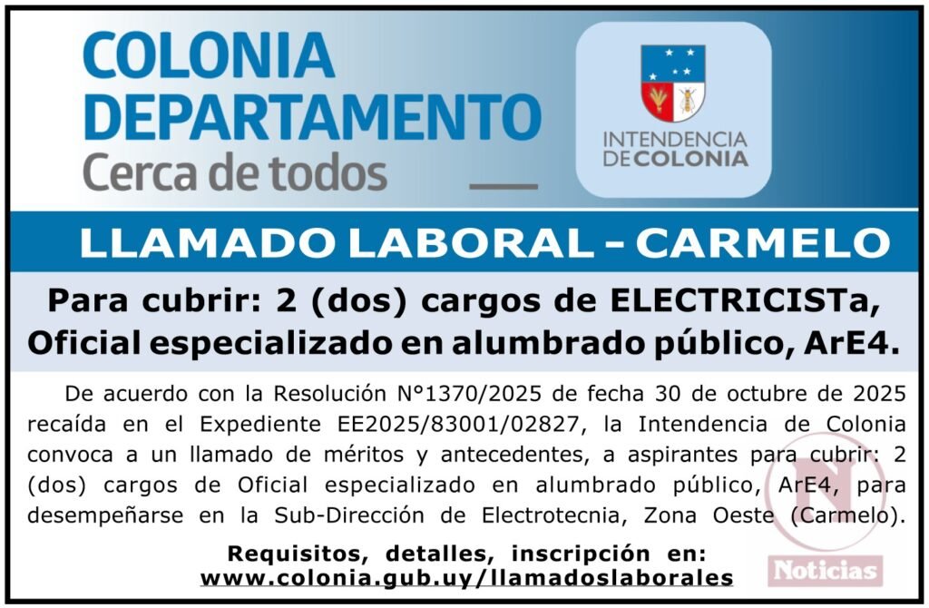De acuerdo con la Resolución N°1370/2025 de fecha 30 de octubre de 2025 recaída en el Expediente EE2025/83001/02827, la Intendencia de Colonia convoca a un llamado de méritos y antecedentes, a aspirantes para cubrir: 2 (dos) cargos de Oficial especializado en alumbrado público, ArE4, para desempeñarse en la Sub-Dirección de Electrotecnia, Zona Oeste (Carmelo).