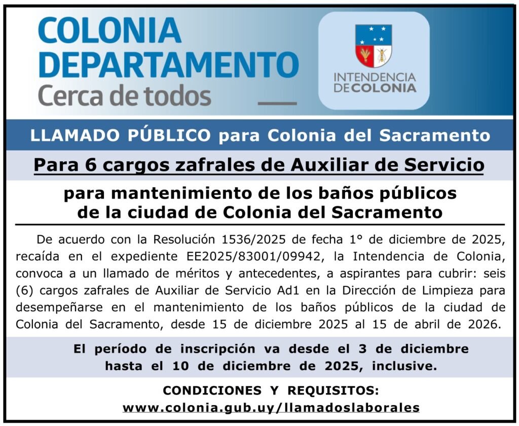 De acuerdo con la Resolución 1536/2025 de fecha 1° de diciembre de 2025, recaída en el expediente EE2025/83001/09942, la Intendencia de Colonia, convoca a un llamado de méritos y antecedentes, a aspirantes para cubrir: seis (6) cargos zafrales de Auxiliar de Servicio Ad1 en la Dirección de Limpieza para desempeñarse en el mantenimiento de los baños públicos de la ciudad de Colonia del Sacramento, desde 15 de diciembre 2025 al 15 de abril 2026.