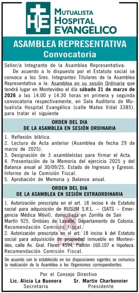 Mutualista Hospital Evangelico – Asamblea Representativa Convocatoria
