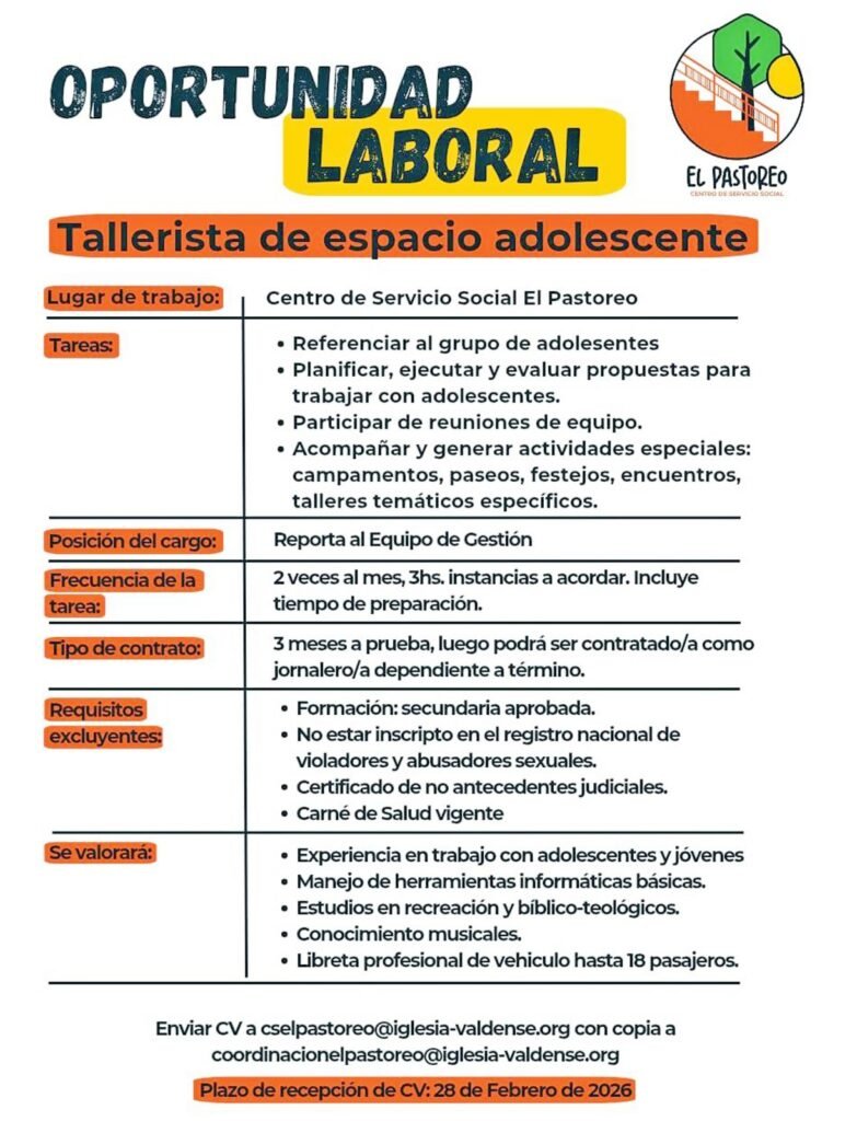 Oportunidad Laboral – Tallerista de espacio adolescente