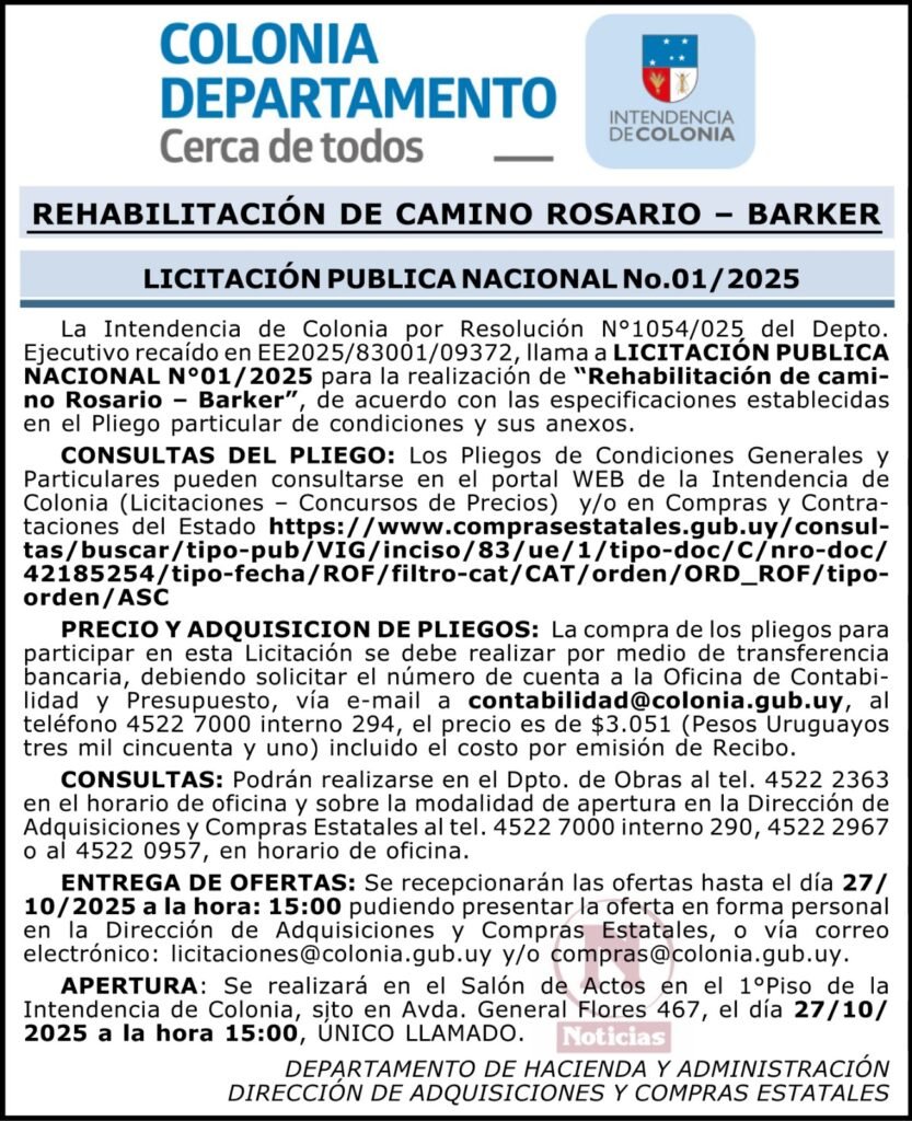 La Intendencia de Colonia por Resolución N°1054/025 del Depto. Ejecutivo recaído en EE2025/83001/09372, llama a LICITACIÓN PUBLICA NACIONAL N°01/2025 para la realización de “Rehabilitación de camino Rosario – Barker”, de acuerdo con las especificaciones establecidas en el Pliego particular de condiciones y sus anexos.