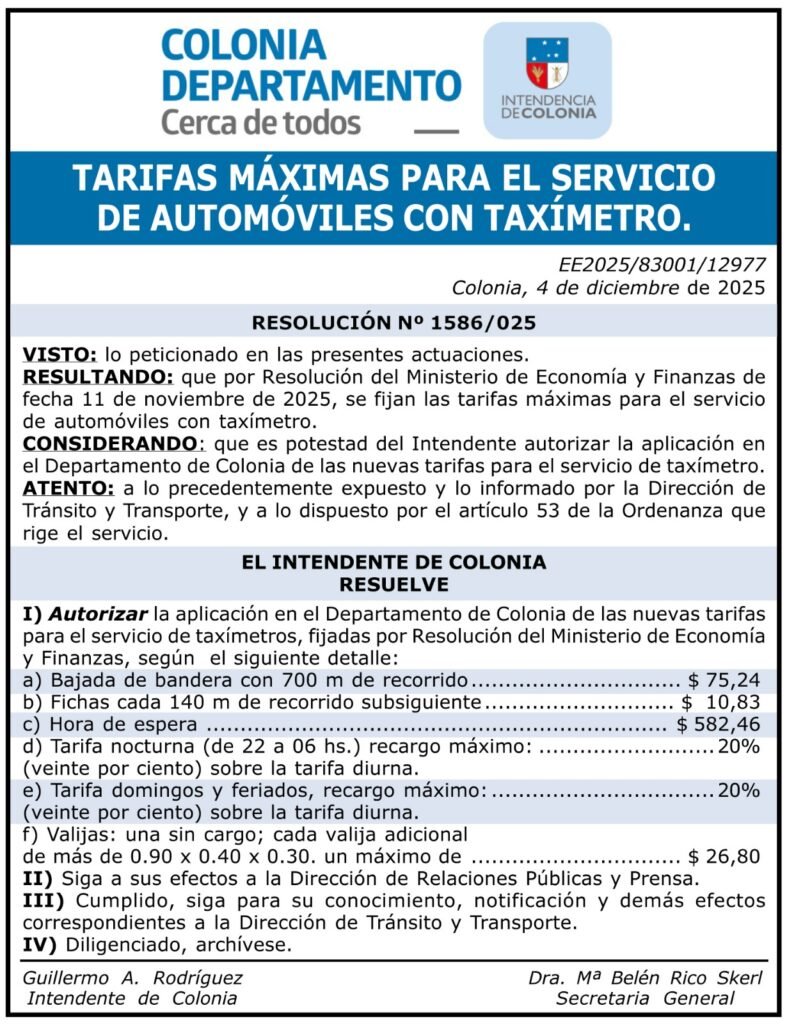 I) Autorizar la aplicación en el Departamento de Colonia de las nuevas tarifas para el servicio de taxímetros, fijadas por Resolución del Ministerio de Economía y Finanzas, según el siguiente detalle:
