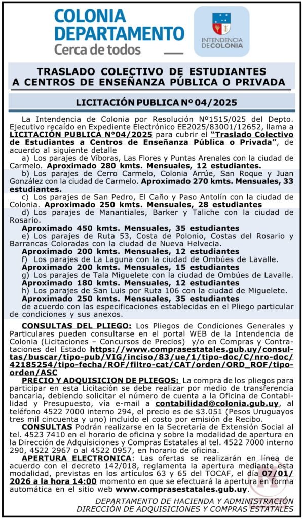 La Intendencia de Colonia por Resolución Nº1515/025 del Depto. Ejecutivo recaído en Expediente Electrónico EE2025/83001/12652, llama a LICITACIÓN PUBLICA N°04/2025 para cubrir el “Traslado Colectivo de Estudiantes a Centros de Enseñanza Pública o Privada”, de acuerdo al siguiente detalle